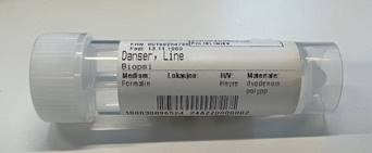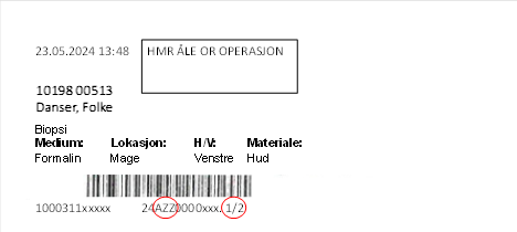 Prøvebeholder merkes med unik ID skrevet ut via HP Link. Etikett plasseres korrekt på prøvebeholder som vist i eksempel under. Kontroller pasientopplysningene på etiketten, navn og fødselsnummer. Ved flere prøvebeholdere skal beholdere være merket med rett nummer (Eks: 1 av 2, 2 av 2) i tråd med opplysninger fra forordning. Numrene står da angitt nede til høyre på etiketter som er skrevet ut. AZZ er unikt for Avdeling for Patologi Ålesund, står det noe annet, er prøven ikke rekvirert til oss (TYY er St.Olavs).