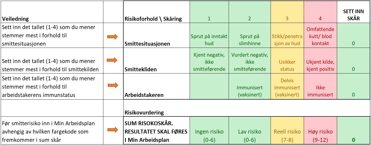 Bruk tabellen til hjelp for risikovurdering (aktiv tabell for beregning ligger under Relatert!) Sum skår gir ingen -, lav -, reell - eller høy risiko, og skal settes inn i Min Arbeidsplan ved rapportering av hendelse.