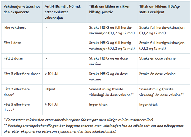 Kilden er HBsAg-positiv eller hepatitt B-status er ukjent: · Iverksett tiltak basert på den eksponertes vaksinasjonsstatus og ev. resultat av tidligere hepatitt B-antistoffprøver (se tabell 4).  |